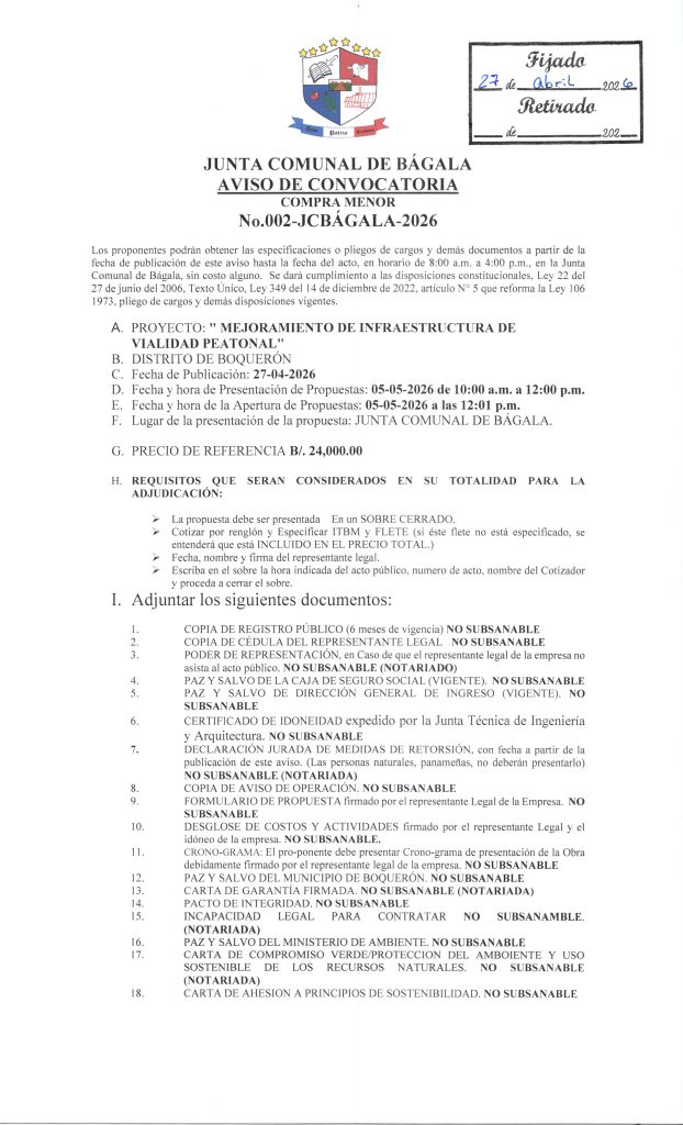 -NoticiasAVISO DE CONVOCATORIA DE LA JUNTA COMUNAL DE CORDILLERA PARA: «MEJORAMIENTO DEL CENTRO DE SALUD DE CORILLERA 13 de abril de 2026Read more -NoticiasAVISO DE CONVOCATORIA DE LA JUNTA COMUNAL DE GUAYABAL PARA: «MEJORAMIENTO DE INFRAESTRUCTURA COMUNITARIA EN EL CORREGIMIENTO DE GUAYABAL» 13 de abril de 2026Read more -NoticiasPUBLICACIÓN DE CUADRO DE COTIZACIONES DE LA JUNTA COMUNAL DE GUAYABAL PARA: «SUMINISTRO DE MATERIALES PARA UNIDADES DE VIVIENDAS» 6 de abril de 2026Read more