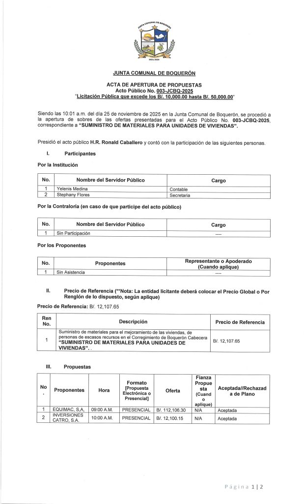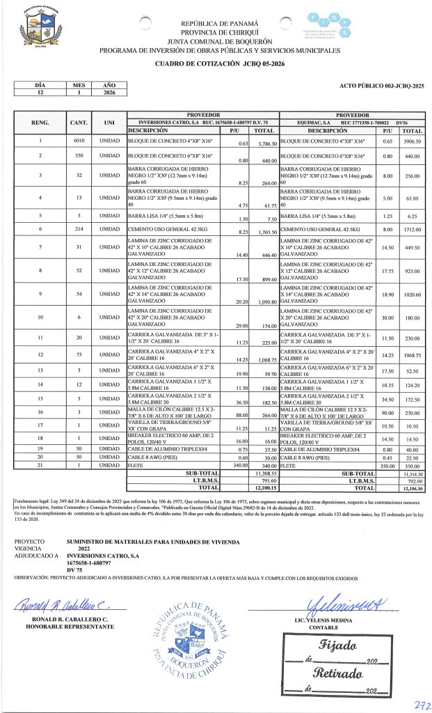 AVISO DE CONVOCATORIA DE LA JUNTA COMUNAL DE BOQUERÓN, PARA:»SUMINISTRO DE MATERIALES PARA UNIDADES DE VIVIENDAS».