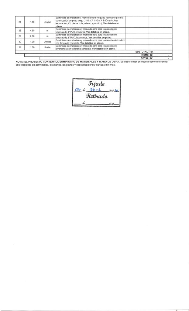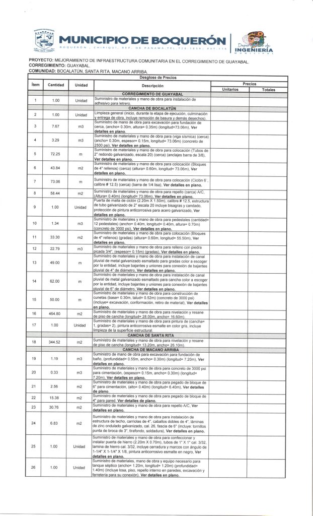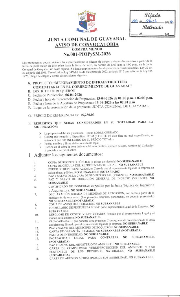 -NoticiasPUBLICACIÓN DE CUADRO DE COTIZACIONES DE LA JUNTA COMUNAL DE GUAYABAL PARA: «SUMINISTRO DE MATERIALES PARA UNIDADES DE VIVIENDAS» 6 de abril de 2026Read more -NoticiasAVISO DE NUEVA CONVOCATORIA PARA «MEJORAMIENTO DE CAMINOS, CUNETAS Y PARADAS EN EL DISTRITO DE BOQUERÓN, ETAPA II» 1 de abril de 2026Read more -NoticiasAVISO DE CONVOCATORIA PARA: «MEJORAMIENTO DE ACUEDUCTO EN LA COMUNIDAD DE SANTA MARTA HASTA LA COMUNIDAD DE PARAISO, CORREGIMIENTO DE PARAISO, DISTRITO DE BOQUERÓN, ETAPA I» 30 de marzo de 2026Read more