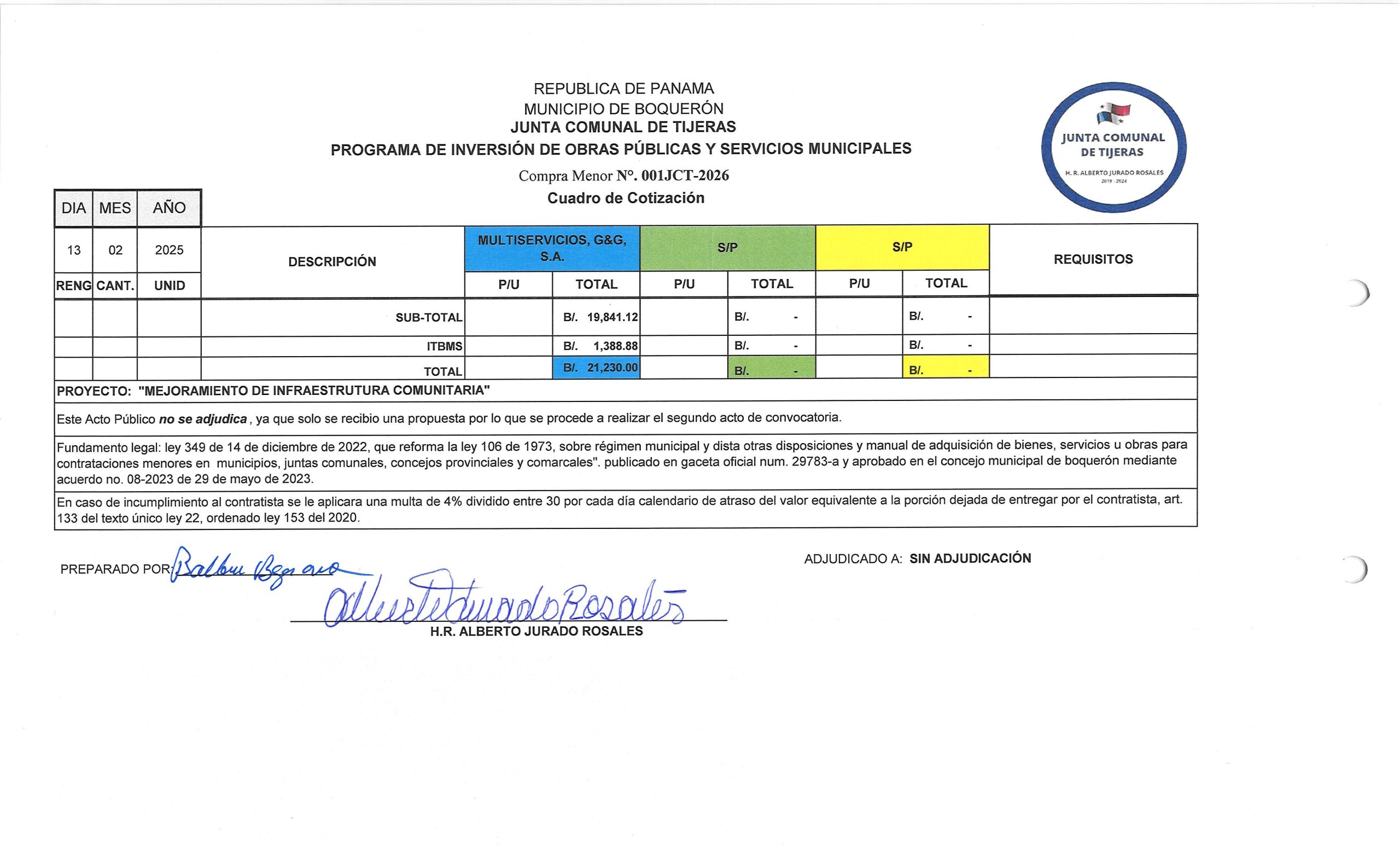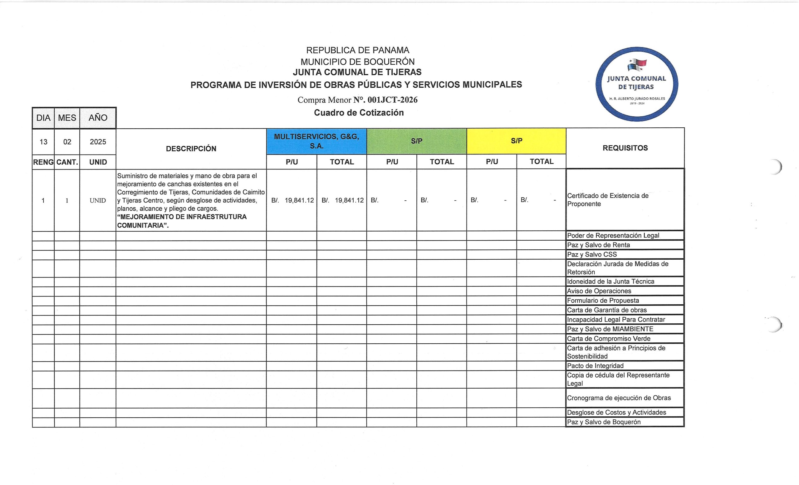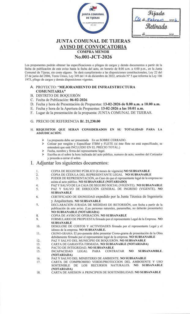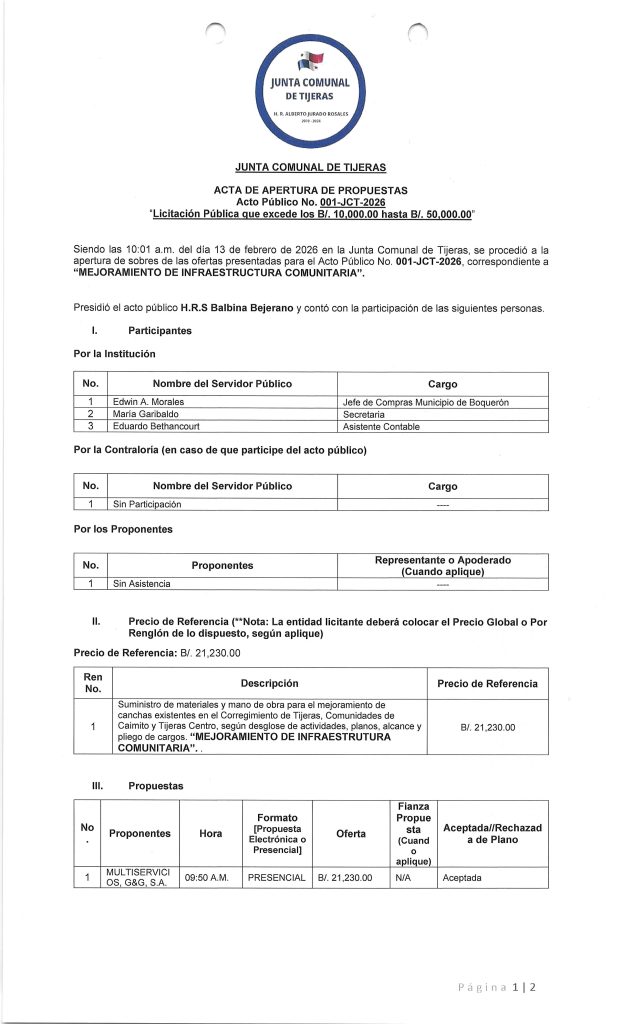 -NoticiasSEGUNDO AVISO DE CONVOCATORIA DE LA JUNTA COMUNAL DE TIJERAS PARA: «MEJORAMIENTO DE INFRAESTRUCTURA COMUNITARIA» 23 de febrero de 2026Read more -NoticiasPUBLICACIÓN DE CUADRO DE COTIZACIONES PARA: «MEJORAMIENTO DE CAMINOS EN EL CORREGIMIENTO DE PARAÍSO. VIGENCIA 2021» 10 de febrero de 2026Read more -NoticiasAVISO DE CONVOCATORIA PARA: «MEJORAMIENTO DE CAMINOS CUNETAS Y PARADAS EN EL DISTRITO DE BOQUERÓN, ETAPA II». 10 de febrero de 2026Read more