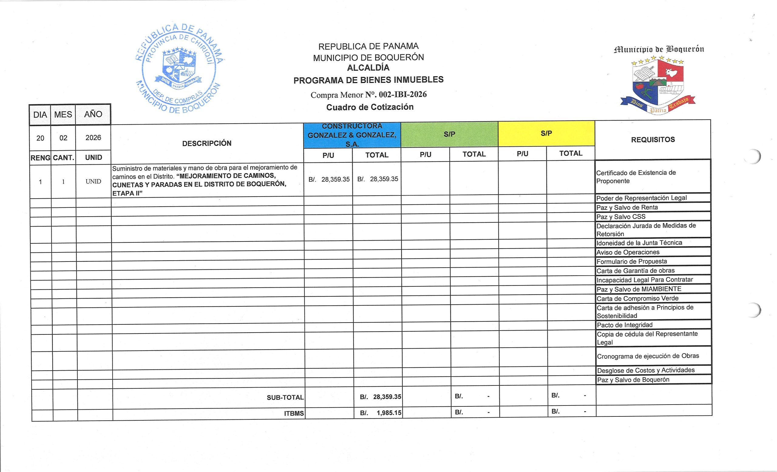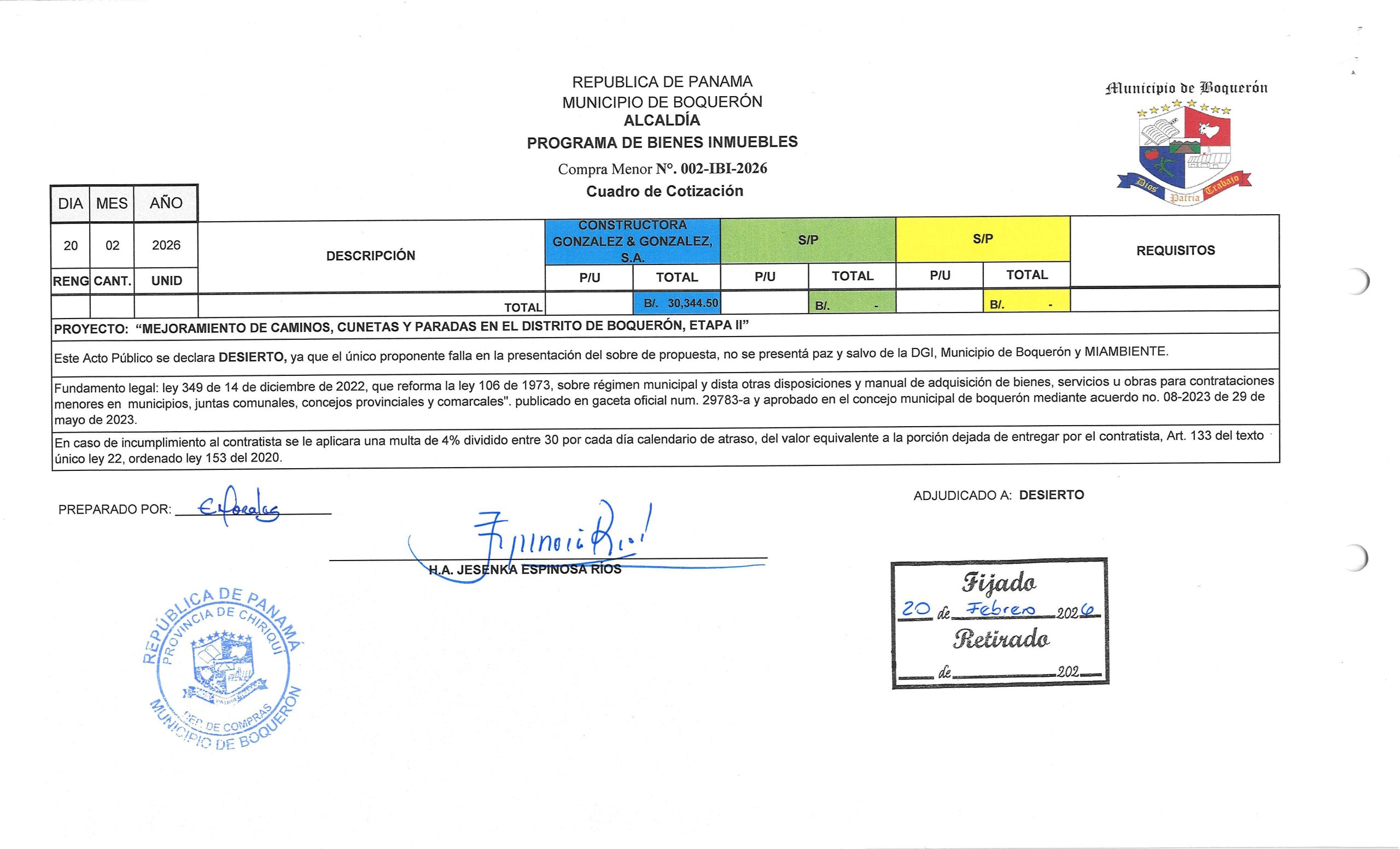 -NoticiasPUBLICACIÓN DE CUADRO DE COTIZACIONES DE LA JUNTA COMUNAL DE GUAYABAL PARA: «SUMINISTRO DE MATERIALES PARA UNIDADES DE VIVIENDAS» 6 de abril de 2026Read more -NoticiasAVISO DE NUEVA CONVOCATORIA PARA «MEJORAMIENTO DE CAMINOS, CUNETAS Y PARADAS EN EL DISTRITO DE BOQUERÓN, ETAPA II» 1 de abril de 2026Read more -NoticiasAVISO DE CONVOCATORIA PARA: «MEJORAMIENTO DE ACUEDUCTO EN LA COMUNIDAD DE SANTA MARTA HASTA LA COMUNIDAD DE PARAISO, CORREGIMIENTO DE PARAISO, DISTRITO DE BOQUERÓN, ETAPA I» 30 de marzo de 2026Read more -NoticiasAVISO DE CONVOCATORIA PARA: «MEJORAMIENTO DE LA CANCHA SINTÉTICA, EN LA COMUNIDAD DE CORDILLERA ARRIBA, CORREGIMIENTO DE CORDILLERA, DISTRITO DE BOQUERÓN, ETAPA II». 23 de febrero de 2026Read more