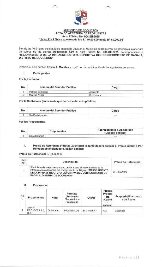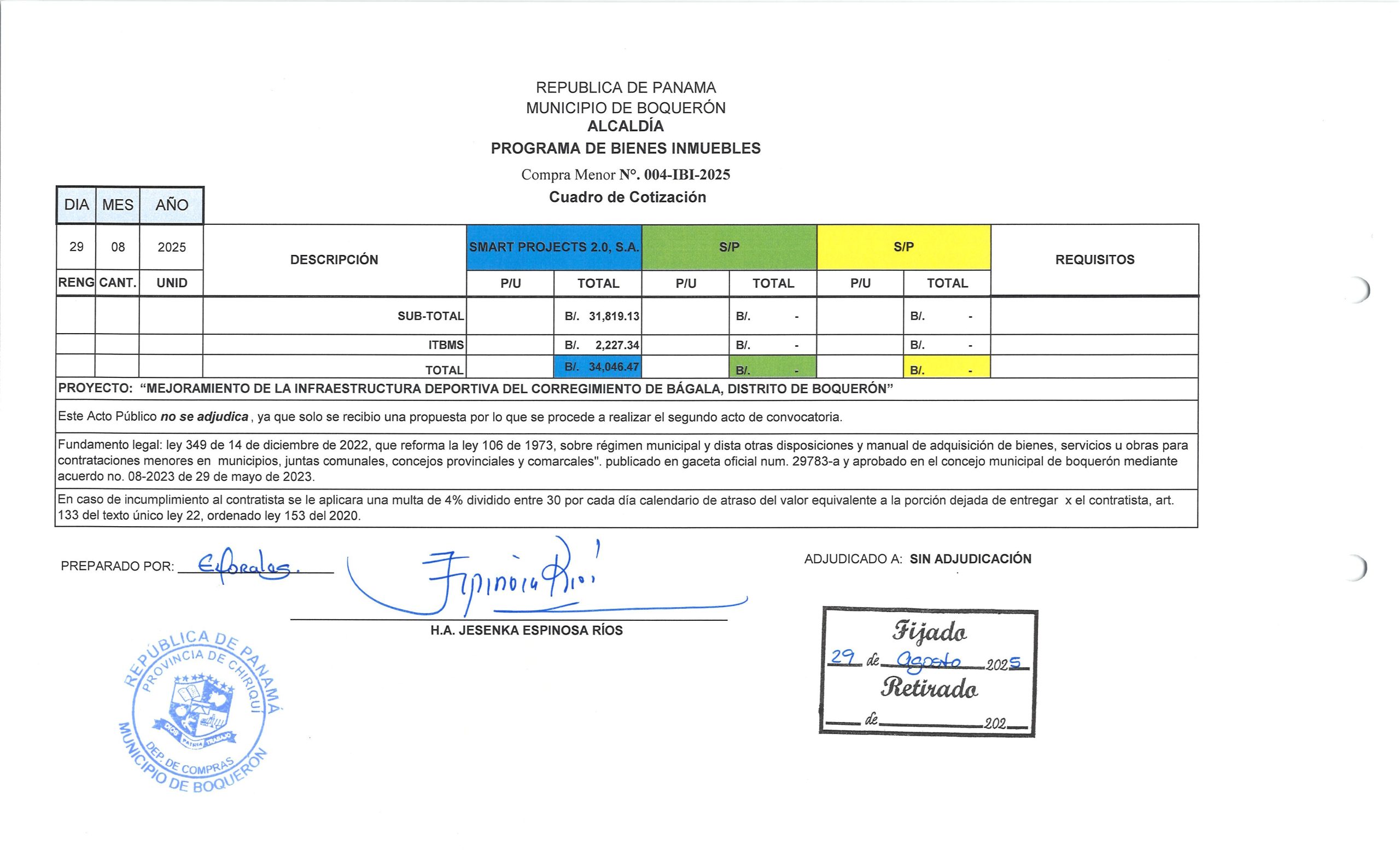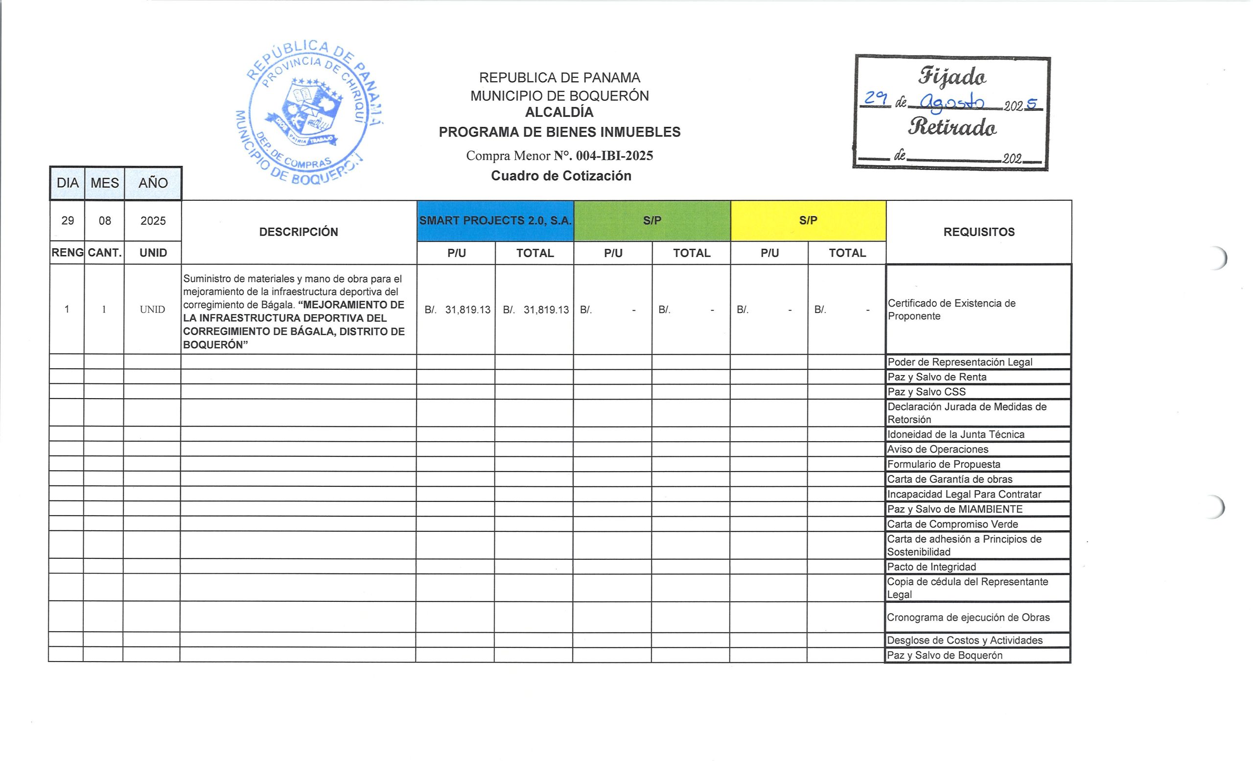 AVISO DE CONVOCATORIA PARA: «MEJORAMIENTO DE LA INFRAESTRUCTURA DEPORTIVA DEL CORREGIMIENTO DE BÁGALA, DISTRITO DE BOQUERÓN»