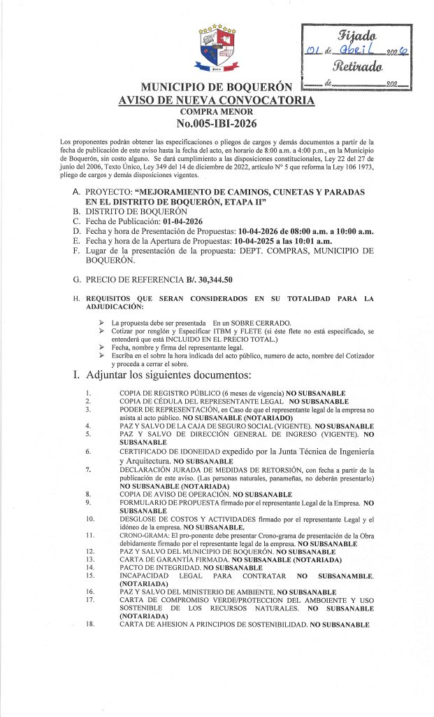 -NoticiasAVISO DE CONVOCATORIA PARA: «MEJORAMIENTO DE LA CANCHA SINTÉTICA, EN LA COMUNIDAD DE CORDILLERA ARRIBA, CORREGIMIENTO DE CORDILLERA, DISTRITO DE BOQUERÓN, ETAPA II». 23 de febrero de 2026Read more -NoticiasSEGUNDO AVISO DE CONVOCATORIA DE LA JUNTA COMUNAL DE TIJERAS PARA: «MEJORAMIENTO DE INFRAESTRUCTURA COMUNITARIA» 23 de febrero de 2026Read more -NoticiasPUBLICACIÓN DE CUADRO DE COTIZACIONES PARA: «MEJORAMIENTO DE CAMINOS EN EL CORREGIMIENTO DE PARAÍSO. VIGENCIA 2021» 10 de febrero de 2026Read more -NoticiasAVISO DE CONVOCATORIA PARA: «MEJORAMIENTO DE CAMINOS CUNETAS Y PARADAS EN EL DISTRITO DE BOQUERÓN, ETAPA II». 10 de febrero de 2026Read more
