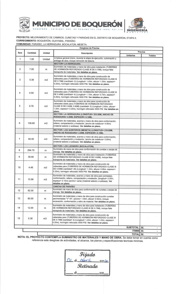 -NoticiasSEGUNDO AVISO DE CONVOCATORIA DE LA JUNTA COMUNAL DE TIJERAS PARA: «MEJORAMIENTO DE INFRAESTRUCTURA COMUNITARIA» 23 de febrero de 2026Read more -NoticiasPUBLICACIÓN DE CUADRO DE COTIZACIONES PARA: «MEJORAMIENTO DE CAMINOS EN EL CORREGIMIENTO DE PARAÍSO. VIGENCIA 2021» 10 de febrero de 2026Read more -NoticiasAVISO DE CONVOCATORIA PARA: «MEJORAMIENTO DE CAMINOS CUNETAS Y PARADAS EN EL DISTRITO DE BOQUERÓN, ETAPA II». 10 de febrero de 2026Read more