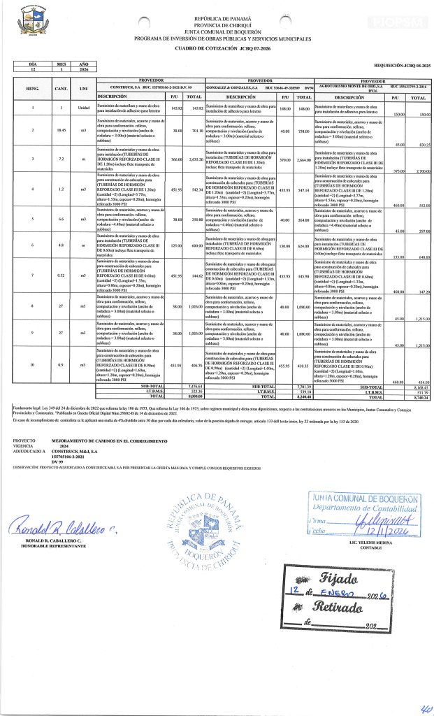 -NoticiasPUBLICACIÓN DE CUADRO DE COTIZACIONES DE LA JUNTA COMUNAL DE CORDILLERA PARA: «OBRAS SOCIALES 2024» 3 de febrero de 2026Read more -NoticiasPUBLICACIÓN DE CUADRO DE COTIZACIONES DE LA JUNTA COMUNAL DE BOQUERÓN PARA: «MEJORAMIENTO DE CAMINOS EN EL CORREGIMIENTO» 30 de enero de 2026Read more -NoticiasAVISO DE CONVOCATORIA PARA: «MEJORAMIENTO DE INFRAESTRUCTURA COMUNITARIA, CORREGIMIENTO DE BOQUERÓN, DISTRITO DE BOQUERÓN» 15 de enero de 2026Read more -NoticiasAVISO DE CONVOCATORIA DE LA JUNTA COMUNAL DE BÁGALA PARA: «MEJORAMIENTO A LA CANCHA DE CABUYA» 13 de enero de 2026Read more