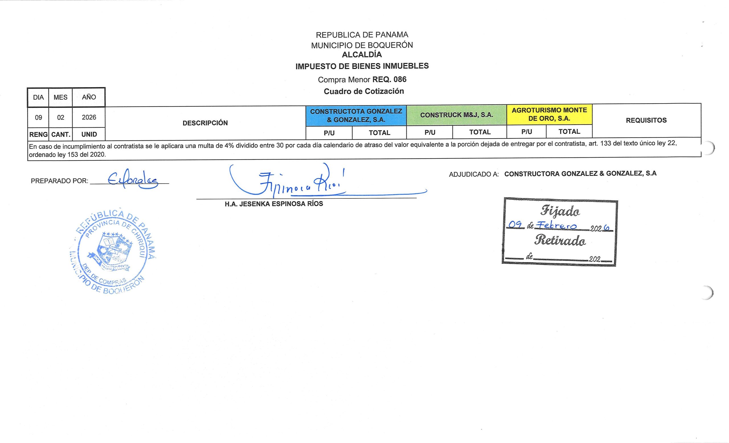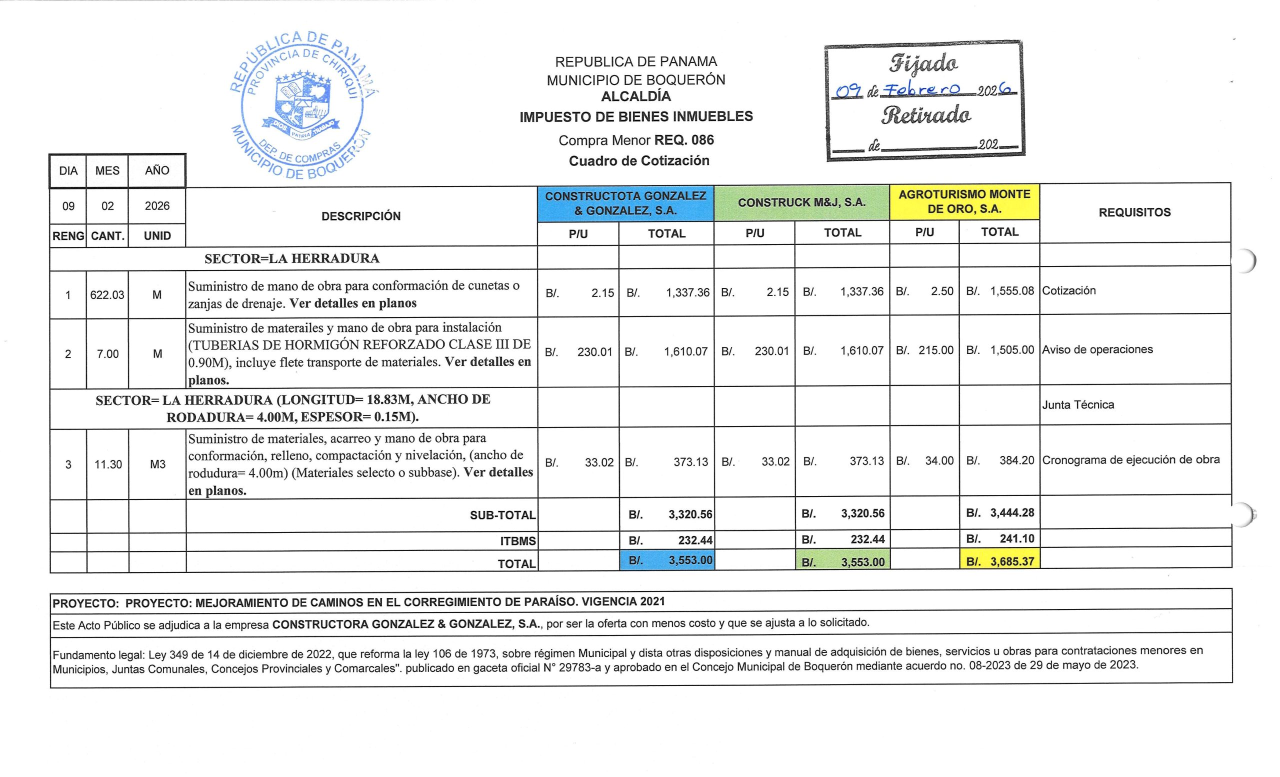 PUBLICACIÓN DE CUADRO DE COTIZACIONES PARA: «MEJORAMIENTO DE CAMINOS EN EL CORREGIMIENTO DE PARAÍSO. VIGENCIA 2021»
