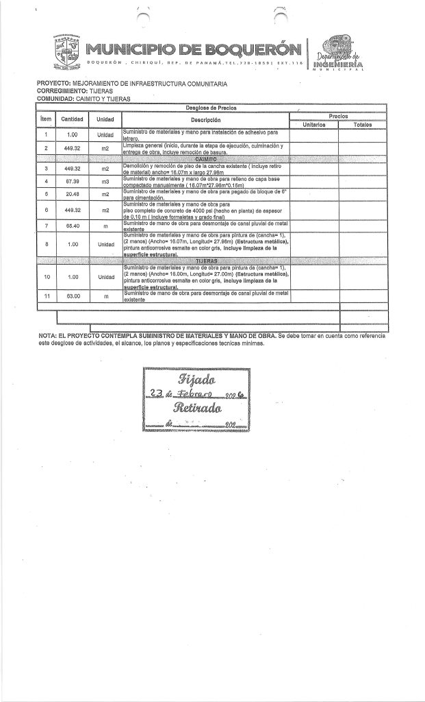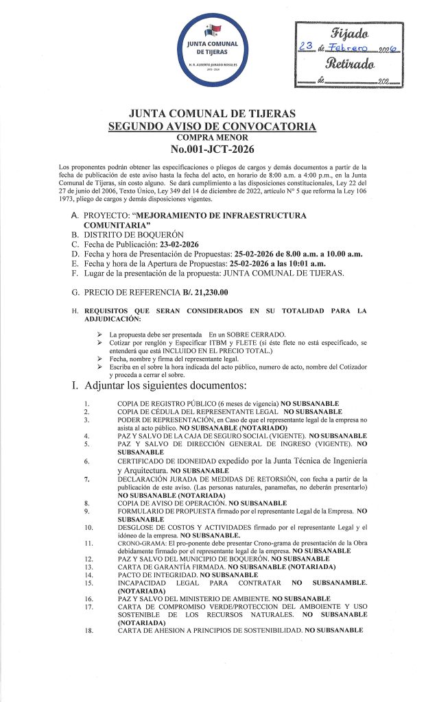-NoticiasAVISO DE CONVOCATORIA PARA: «MEJORAMIENTO DE CAMINOS CUNETAS Y PARADAS EN EL DISTRITO DE BOQUERÓN, ETAPA II». 10 de febrero de 2026Read more -NoticiasAVISO DE CONVOCATORIA DE LA JUNTA COMUNAL DE TIJERAS PARA: «MEJORAMIENTO DE INFRAESTRUCTURA COMUNITARIA» 6 de febrero de 2026Read more -NoticiasPUBLICACIÓN DE CUADRO DE COTIZACIONES DE LA JUNTA COMUNAL DE CORDILLERA PARA: «OBRAS SOCIALES 2024» 3 de febrero de 2026Read more